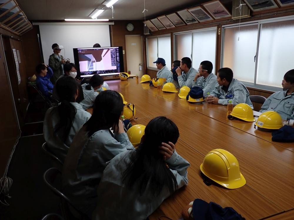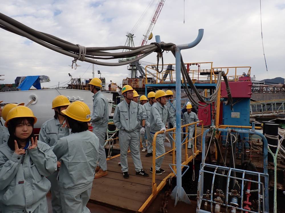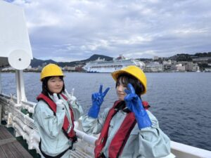 長崎造船株式会社に行きました。大きなクレーンなどがあり近くで船が作られているのを見ることが出来て迫力がありました。また、VRを使って船の内部構造をわかりやすく説明してくれました。配管が通る場所など紙で見るより分かりやすくてびっくりしました。その後は、長崎の中華街を回りました。修学旅行生や可愛い制服を着た同じ高校生が多くて水色の実習服で観光するのが恥ずかしかったです。短い時間でしたが長崎の食べ物を食べたり観光地を回ることが出来て良かったです。たくさんのお土産を買ってしまったので、今後の寄港地で使うお金が心配ですが三崎で食べる海鮮丼は外せないです。