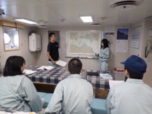 今日は出港予定ではありましたが、明日以降海況がよく、スムーズに航行できるということで、明日出港となりました。船長講義、1等航海士の講義、2等航海士の講義と計3本の講義を受けました。
