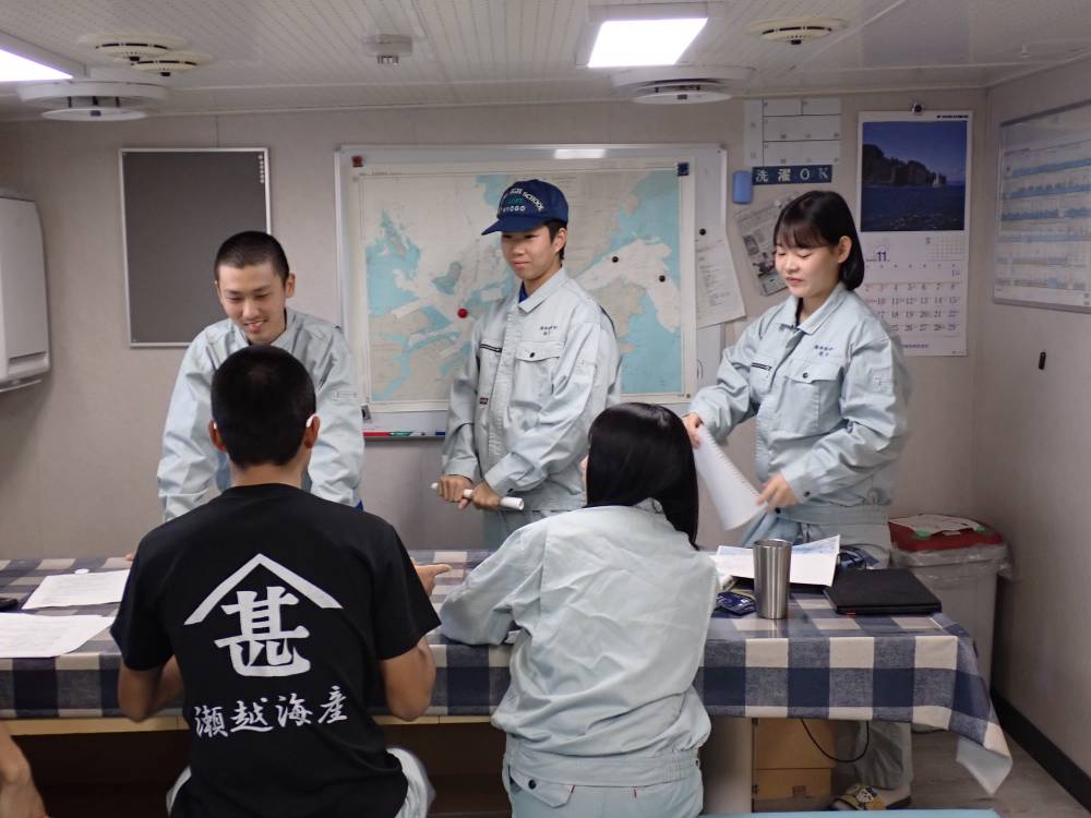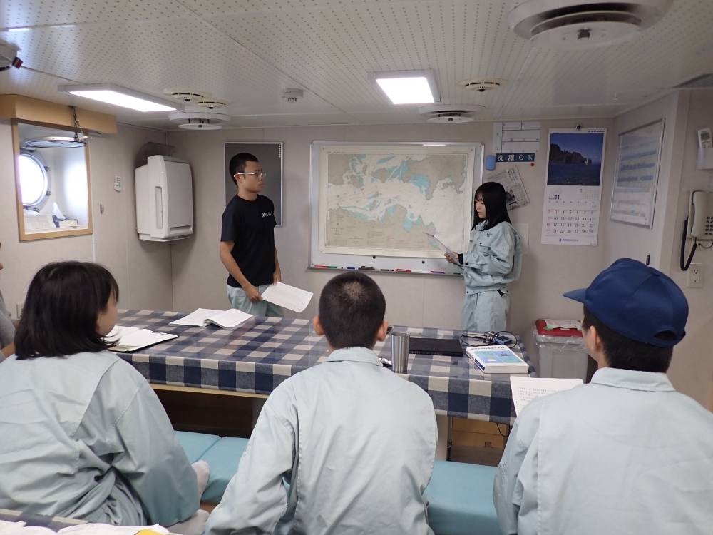 今日も操業予定がなくなったため、作業班は食堂で勉強をしました。法規の小テスト、船長講義と充実した一日でした。私の班は、自主操業が一回もなかったので、少し残念でしたが、前半のトロール調査はなかなか電波も入らず、船酔いも多かったために、湾内で静かに錨泊すると家族や友人と連絡を取ることが出来て、後半の航海も頑張ろうと思うことが出来ました。