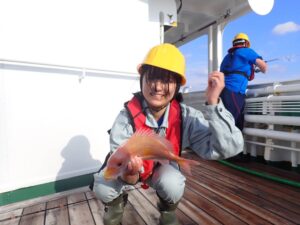 今日は作業で漁獲物の仕分けをしました。魚によって特徴があり、それを瞬時に分けることが大切で、分けた後は調査の為に、紙に記録して作業を終えました。自分はエビの見分けが難しかったけど、とてもやりがいのある作業でした。親からもらった船酔いしない体に感謝し引き続き頑張ろうと思いました。
