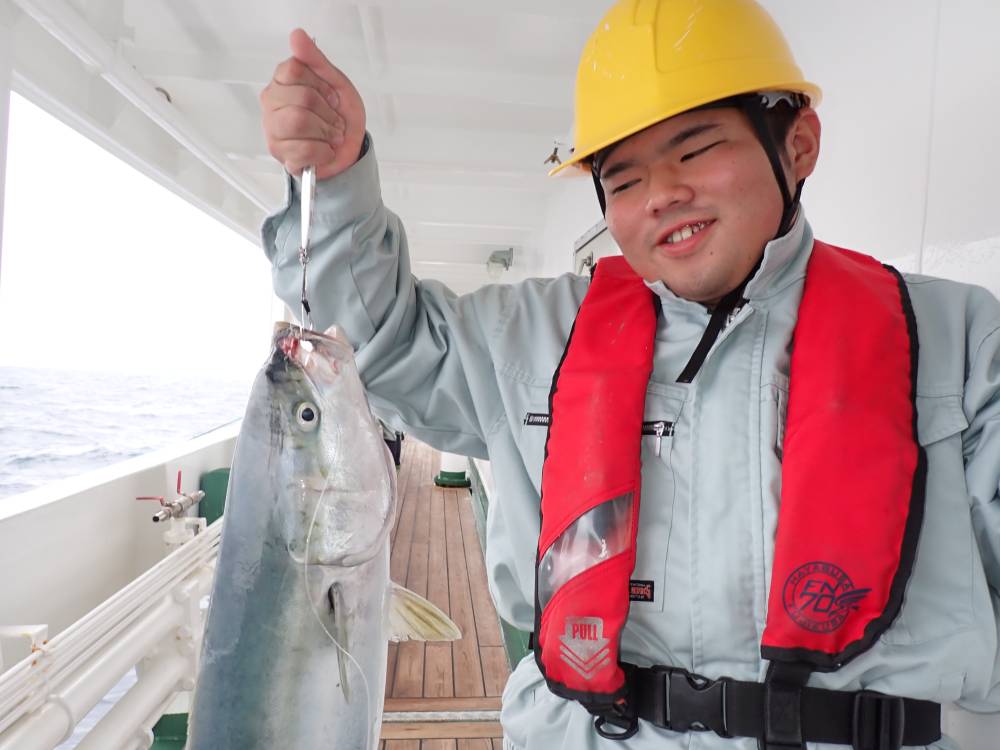 出港して七日目。07時30分に抜錨し、浦郷湾を後にし、調査点まで向かい、トロール調査を開始しました。今回の調査点では本調査の目的であるズワイガニが多く取れました。香住では有名なもので私は高級食材というイメージ持っており、実際に値段が高いものでしたがそんなカニがこんなにも大量に取れるものなのか、と驚き、仕分け作業中はずっとおいしそうだなと思っていました。昨日は時化がひどく浦郷湾に錨泊して4-8のワッチ終わりに釣りをする機会があり、私はアジを狙っていましたが、偶然サゴシが釣れ、とても楽しかったです。島根沖のトロール調査はもう少しで終わってしまうので残りの作業も気を引き締めて頑張ります。