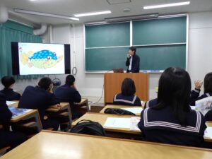 長崎大学では副学部長、菅教授から学部説明と簡単な講義を受けました。印象的だったのは、菌やウィルスなどは、見かけだけでは良いものかわからないというお話、薬は病原体だけではなく、服薬した本人にも悪影響があるというお話、薬で菌を殺すばかりでなく、病原体が体に害をなさないようにすることも大切であるというお話です。水産分野だけとは思えない講義の内容で大変興味深かったです。最後に、教授は「地球の面積の七割を学ぶだけではなく、そのつながりのある地球丸々1つを学ぶ学部です。必ず興味がわくことが見つかります。」とおっしゃっられていました。実際菅教授も薬学部の出身だったらしく、それでも水産を学んでいるうちに、様々な興味がわいてきたとお話しされていました。