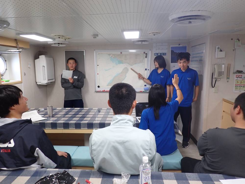今日は午前中にトロール操業を2回行いました。今日は時化予報でしたが、朝デッキに出たときには朝日が見えてとても気持ち良かったです。しかし、魚の仕分けや計測などをしているときに次第に波が高くなってきて、天気の移り変わりが目に見えてわかりました。今日は2回目の作業班で前の作業班の時よりもスムーズに作業することが出来ました。全体の流れがわかっていたので、次にやることを考えながら動くことが出来たと思います。午後からは、隠岐の島陰に入るために場所を移動していたのでトロール操業ができませんでした。なので、生徒食堂で航路学習をしました。今日は、前日の当直の時に指摘いただいた点を修正し、新しく発表原稿を書き直しました。その後、日出没計算を勉強しました。これで、電波が入らない海の上でも日出没の時間を把握することが出来るようになりました。