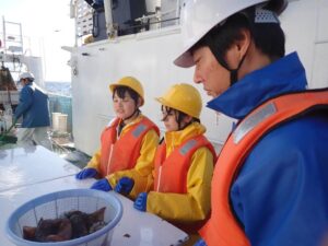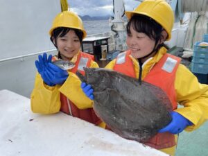今日は自主操業初日でした。一回目は残念ながら魚が獲れませんでしたが、二回目、三回目は、マダイやチダイやハモや大きなヒラメが漁獲できました。水深が変わっただけで漁獲物が変化すること、また漁獲量が変わることを知りました。漁獲物を製品化する際に、タイの棘が厚いゴム手袋を貫通して手に刺さり、大変な作業なんだと思いました。獲れた魚の一部は、船内消費として夕食でいただくことが出来ました。自分で獲った魚は普段よりもおいしく感じました❣明日と明後日はしけるらしいので、朝から酔い止めを飲んで頑張りたいと思います。残り23日頑張ります。