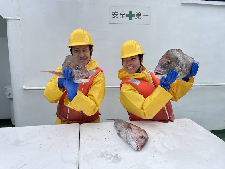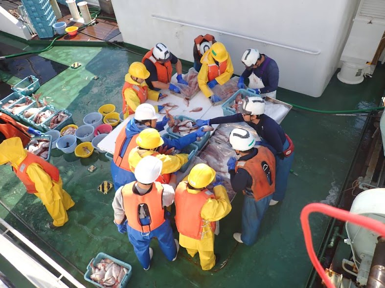 今日は自主操業初日でした。一回目は残念ながら魚が獲れませんでしたが、二回目、三回目は、マダイやチダイやハモや大きなヒラメが漁獲できました。水深が変わっただけで漁獲物が変化すること、また漁獲量が変わることを知りました。漁獲物を製品化する際に、タイの棘が厚いゴム手袋を貫通して手に刺さり、大変な作業なんだと思いました。獲れた魚の一部は、船内消費として夕食でいただくことが出来ました。自分で獲った魚は普段よりもおいしく感じました❣明日と明後日はしけるらしいので、朝から酔い止めを飲んで頑張りたいと思います。残り23日頑張ります。