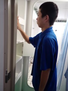 今日も操業予定がなくなったため、作業班は食堂で勉強をしました。法規の小テスト、船長講義と充実した一日でした。私の班は、自主操業が一回もなかったので、少し残念でしたが、前半のトロール調査はなかなか電波も入らず、船酔いも多かったために、湾内で静かに錨泊すると家族や友人と連絡を取ることが出来て、後半の航海も頑張ろうと思うことが出来ました。
