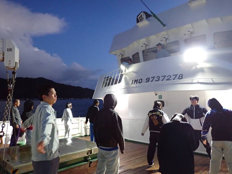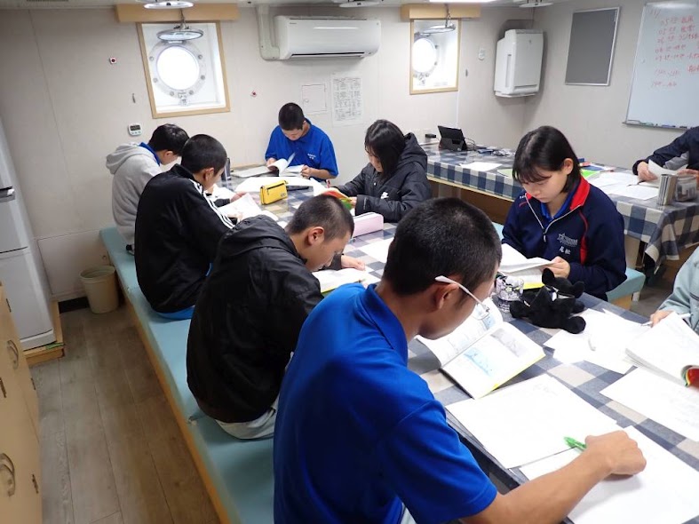 今日も操業予定がなくなったため、作業班は食堂で勉強をしました。法規の小テスト、船長講義と充実した一日でした。私の班は、自主操業が一回もなかったので、少し残念でしたが、前半のトロール調査はなかなか電波も入らず、船酔いも多かったために、湾内で静かに錨泊すると家族や友人と連絡を取ることが出来て、後半の航海も頑張ろうと思うことが出来ました。
