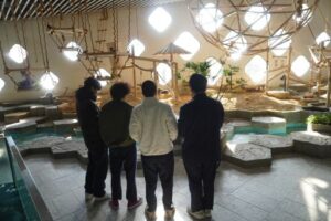 アクアコースの生徒はニフレルで、自然光を取り入れながら、建物の耐震性を高める「ウェブ・ウォール構造」により作り出される空間と、多種多様な生き物のもつ個性にふれる体験を通して、知財と生態系・環境保全について学びました。