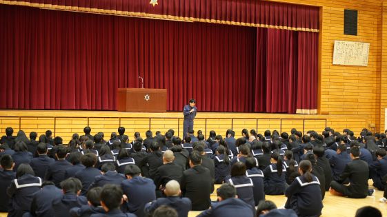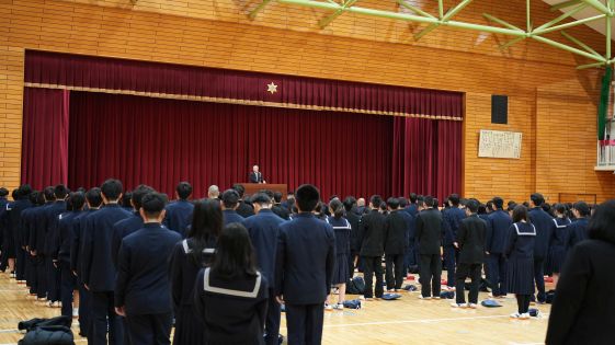 森澄実校長より、「3学期は各学年の集大成です。3年生は学校発表会において学びの成果を発表するとともに、新たな課題を発見し、次のステージに進むこと。2年生は、最高学年となることへの自信を持ち、進路実現に向けた時間とすること。1年生は、高校生として自分の行動に責任を持ち、先輩としての自信をしっかりと持つこと 」のように、各学年の3学期の取り組みについてのお話がありました。
