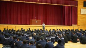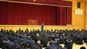 その後、生徒指導部長の谷口先生からはマナー、モラル、ルールについて、特に校則(ルール)や自転車の取り締まりが厳しくなる交通ルールについての講話が、教務部長の安井先生からは教科や成績について、また目標を持った3学期を送ってほしいとの講話がありました。