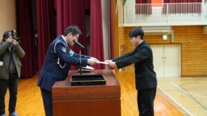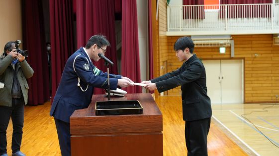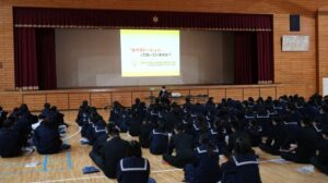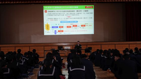 2026-02-20 / 最終更新日時 : 2026-02-20 Administrator おしらせ 自転車セーフティープロジェクト講話・表彰 兵庫県警察自転車セーフティープロジェクト(高校生チャリプロ)において、1年生対象に筆記試験を行い県内第2位の成績を収めました。また、8月~12月の間に全校生で自転車における無事故・無違反を達成したことにより、兵庫県警から表彰を受けました。 警察からの講話では、自転車の青切符の導入についての説明を受け、今後の自転車の交通規則についての理解を深める事が出来ました。