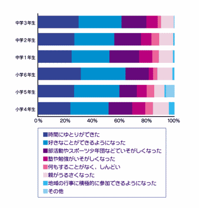 @「時間にゆとりができた」 「好きなことができるようになった」(あわせて約60%) A「部活動やスポーツ少年団などでいそがしい」 「塾や勉強がいそがしくなった」(あわせて約25%) B「なにもすることがなく、しんどい」 「親がうるさくなった」(あわせて約15%) |