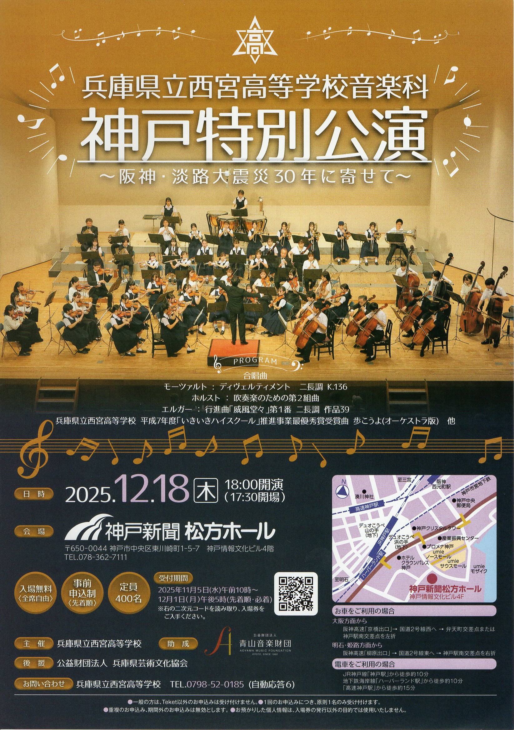 兵庫県立西宮高等学校音楽科による特別講演を12月18日(木)に神戸新聞松方ホールにて行います。