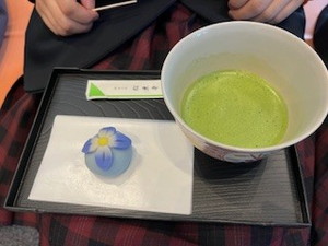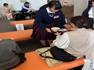 11月1日(土)、明石市立西部市民会館で行われた第49回兵庫県高等学校総合文化祭開会行事で、東・北播磨地区の7校の茶道部員が集い、来場者への呈茶を行いました。椅子に腰かける立礼(りゅうれい)式のお点前を楽しんでいただき、他校の生徒と協力し合い、おもてなしの心を込めて抹茶と和菓子をふるまいました。この日の和菓子は、高校生がデザインして創作和菓子コンクールで優秀賞となった、淡いブルーが特徴的な銘「富貴菊」です。