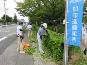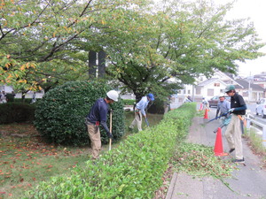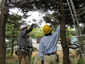 9月23日に加印造園組合(所属の造園業を営む16社)のみなさんが奉仕活動として、本校の正門前と道路に面したフェンス沿いのマツを剪定してくださいました。この奉仕活動は地域内で毎年継続されており、昨年に続き本年も本校でしていただくことになりました。当日は、将来、造園関係の仕事を希望している1・2年生も加わり、剪定方法や段取りから片付けまでの一連の作業を教わりました。プロの「カッコイイ」仕事を目の当たりにし、実りのある時間となりました。加印造園組合の皆さんありがとうございました。