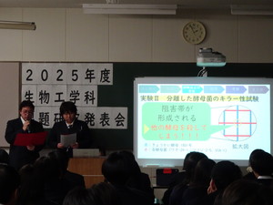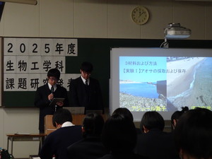 3年生の集大成である課題研究発表会を行いました。バイオマス利用類型、微生物利用類型、植物利用類型の3つ類型の発表を、2年生は会場、1年生はZoomを用いてオンラインで視聴しました。どの発表班も伝え方やスライドを工夫し、1・2年生の今後の参考になるようなわかりやすい発表を行うことができました。