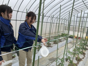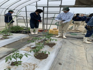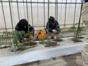 新3年生でトマトの定植を行いました。無加温のビニールハウスです。1月下旬の播種、2月の床移植そしてポット上げなど、育苗を頑張りました。ハウスに換気扇はありますが、加温設備や窓の自動開閉などはありません。雨が降れば内部にしみこんできます。そのような環境ですが、温度管理や土壌水分管理をしっかりと行い、皆さんに「おいしい!」と喜んでいただけるよう頑張ります。