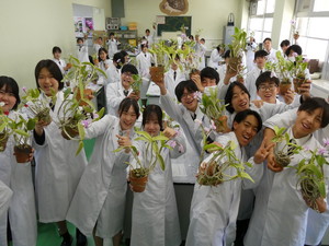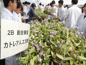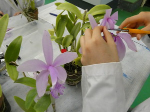 2年生の総合実習で初めて挑むのはカトレアの人工交配です。花の構造を学び、いざ実践へ。ピンセットを持つ手にも力が入ります。理想の姿を夢見ながら、ちいさな一粒の花粉塊を丁寧に柱頭へと運んでいきます(ハチになった気持ち)。その探究心は授業時間内に留まらず、放課後の実習棟には、夢中で人工交配を続ける生徒たちの姿がありました。夏には成長した種子に出会えることを願って。成功の報告が今から待ち遠しいです。