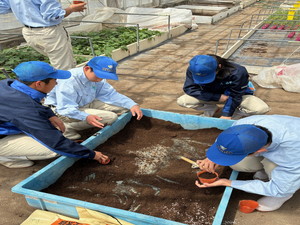 昨年度、加古川市の事業である、「自然にやさしい農業促進事業」の一環として、pH・EC・硝酸態窒素の土壌分析についての講義を受けました。昨年度学んだことを活かし、今年度は課題研究の一環で栽培中の土壌の分析を行っています。学んだことを思い出しながら分析を行っていました。年間を通じて分析を行い良い研究にしてもらいたいです。