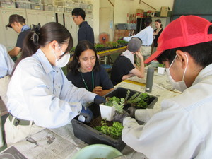 園芸科草花類型3年生の実習で、東加古川にある老人保健施設緑樹苑に花壇の寄せ植え交流を行いました。寄せ植え交流では、生徒が春休みの実習から栽培管理し育てたマリーゴールド、ペチュニア、日々草、ベゴニアセンパフローレンス、ジニアなどを使って、入居者の方たちとのんびり会話を楽しみながらプランターの寄せ植えを行いました。はじめは、少しお互いに緊張をしていましたが徐々に打ち解けていき、入居者さんの中には見事な手さばきでプランターに寄せ植えをされる方もいらっしゃいました。生徒は普段の実習や授業では得ることのできない経験をさせていただきました。今回の実習を通して学んだことをこれからの学校の実習や後輩の指導に活かしてほしいと願っています。