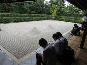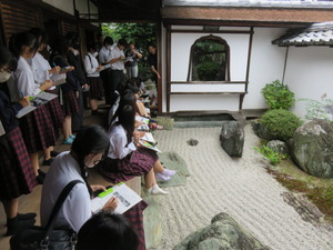 10月3日に造園科3年生が京都の庭園を見学しました。まず、国宝、大徳寺大仙院の枯山水庭園(室町時代の代表的な庭園)で禅の教えについて学びました。次に世界文化遺産である龍安寺を見学し、室町末期に作庭された石庭や水戸光圀の寄進といわれる蹲(つくばい)を見学。最後は、通称「金閣寺」として知られる世界文化遺産、鹿苑寺に向かい、鏡湖池のつくりや龍門滝、夕佳亭(茶室)を見学しました。入学してから様々な庭園を見学・学習してきました。その集大成として全員が真剣に見て学ぶ特別な一日となりました。これらの学びは、人生を歩んでいくうえで、困難を乗り越えるヒントになることと願っています。