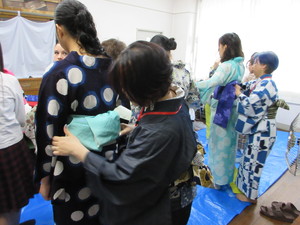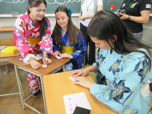 本校はニュージーランド フレイザー高校と提携し、お互いの学校を毎年交互に訪問する交流を行っています。 10月3日、PTAの皆さんが、ニュージーランドの高校生に浴衣を着せてくださいました。美しい日本の伝統文化を体験し、盆踊りや折り紙などを通して生徒たちとも交流しました。みんな笑顔で、国や言葉を越えた素敵な時間になりました。PTAのみなさん、ご協力ありがとうございました。