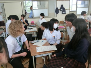 本校はニュージーランド フレイザー高校と提携し、お互いの学校を毎年交互に訪問する交流を行っています。 登校2日目、フレイザーの生徒は1年生の英会話の授業に参加し、本校生と英語で会話を楽しみました! また国語や社会などの授業にも加わり、日本の学校生活を体験。午後は3年生造園科の実習で多肉植物の寄せ植えを一緒に行い、笑顔があふれる時間になりました。この日のために寄せ植えの作り方を説明する英単語を調べてきた生徒もいて、本プログラムが本校生の英語学習へのよいモチベーションになっているようです。 生徒たちは「英語で伝わる楽しさ」を感じながら、交流をどんどん深めています!