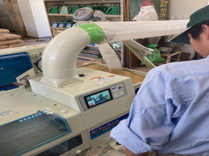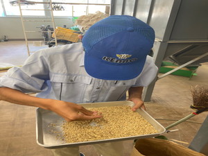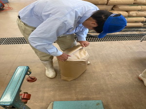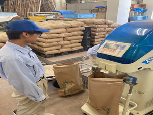 1年生の総合実習の時間に先日収穫し、乾燥した水稲「にこまる」の籾すり実習を行いました。1年生にとっては初めての体験となります。籾すりを終えた玄米を袋詰めしたところ、59袋出来ました。今年は猛暑が続き、「収量が減るのではないか」と心配していましたが、結果的には昨年を上回る収量となりました。生徒達は前回籾すりをした「きぬむすめ」と今回籾すりをした「にこまる」の袋数の多さに驚いていました。今後は等級検査、精米を行います。