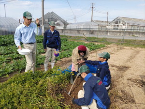 今年度より、農業科では加古川市の事業である、「自然にやさしい農業促進事業」を行っています。その一環として、2年農業科の生徒を対象にpH・EC・硝酸態窒素の土壌分析についての講義を東京農業大学の教授中丸康夫様を外部講師にお招きし、行いました。現在、有機農業を行っている圃場の栽培前と栽培中の土壌、県農の圃場で興味がある土壌を班ごとに分析しました。結果としては、有機栽培を行っている圃場が栽培前より栽培後のEC、硝酸態窒素が高い結果となり、その結果から生徒たちは色々な考察をしていました。農業を科学的な視点で見るとが面白く感じている生徒もいました。また、大学の授業がどのようなものなのかを体験することが出来、大学進学に興味を持つ人も何人かいました。3年次の課題研究、進路に今回の講義を活かしてもらいたいと思います。
