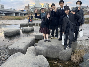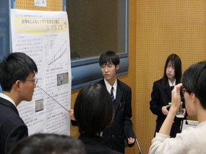 シイタケは椎の木、マツタケは松の木、ふつうキノコは特定の樹木から特定の種類が生えてきます。2年生たちによる今回のテーマは、「杉の木でシイタケを発生させられるか」というユニークな研究に成功しました。この内容を高校と大学が連携する研究発表の場でポスター発表を行いました。生物工学科の研究設備を活用したこの発表は、たくさんの先生や大学生からも注目していただき、にぎやかで楽しいセッションとなりました。帰りは京都のパワースポット「鴨川デルタ」をめぐって文化にも接して充実した一日でした。次は杉の木でマツタケを育てることができるでしょうか。