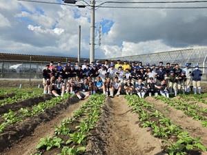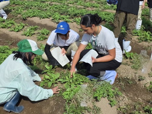 食品科学科の1年生がフレイザー高校生とダイコンの栽培管理を行いました。二人一組で担当している一畝にフレイザー高校生が1人ずつ入り、3人で実習を行いました。最初に発芽率の調査として発芽数を数えました。生徒はフレイザーの生徒に英語で実習内容を伝えながら、協力して数を数え、プリントに記入していきました。その後、除草、水やりと、いつもの管理作業も英語で伝えながらの実習は難しいながらも生徒は交流を大いに楽しんでいました。フレイザー高校の生徒も楽しみながら取り組んでいました。レポートには「いつもの実習より楽しかった」「つたない英語が伝わった時は嬉しかった」「英語を勉強する必要性を感じた」などの感想を書いてくれました。
