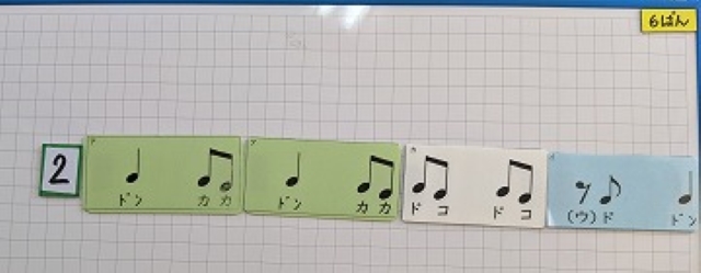 ・音符や休符のそれぞれの長さを意識しながらリズムカードの適切な組み合わせを考え,リズム譜を作ることができる。