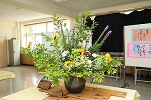 女子5名で月1回金曜日に生物実験室で活動しています。毎回、季節に合ったお花を生けています。