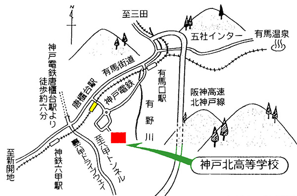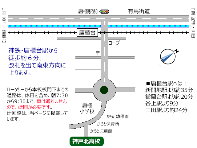 県道15号神戸三田線(有馬街道)「唐櫃駅前」交差点を谷上方面(西)からなら右折、岡場方面(東)からなら左折し、踏切を越えて坂道を直進。途中のロータリーを越え、唐櫃小学校を右手に見て更に進む。小学校の裏門を越えた所で左折すると、本校の校門が見える。
