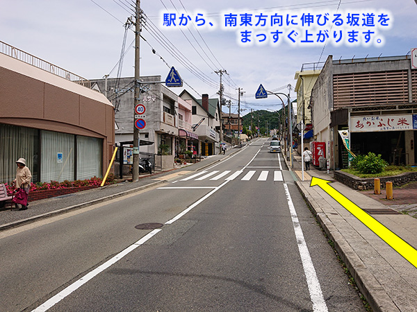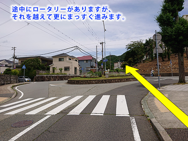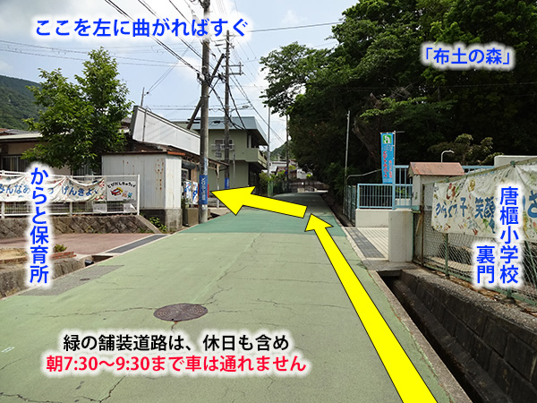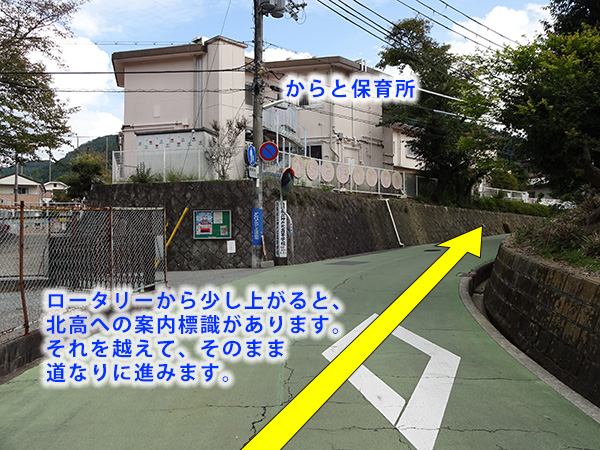 神戸電鉄 唐櫃台駅 改札を出て、南東方向に伸びる坂道を上がる。途中のロータリーを越えて進み、唐櫃小学校を右手に見ながら更に進む。小学校の裏門を越えた所で左折すると、校門が見える。成人男性がゆっくり目に歩いて、駅から徒歩6分。