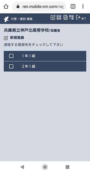 欠席・遅刻連絡をする学年・組(=お子様の学年・組)にチェックを入れて、次に進んでください。