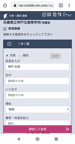 1年1組の生徒の欠席連絡を登録する画面です。欠席か遅刻かを選び、各項目を入力します。日付と理由は、画面から選択します。
