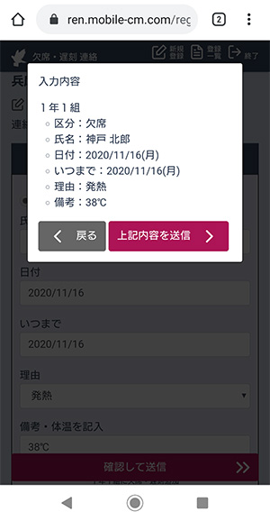 遅刻を選んだ場合は、入力項目は少し異なります。入力が終わったら、下の「確認して送信」をタップ。