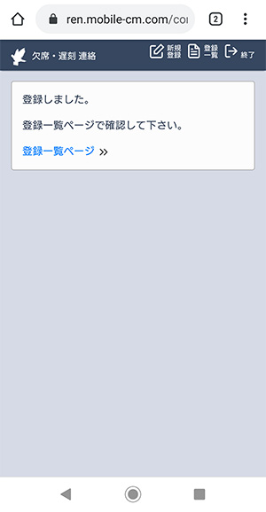 右の画面が出れば、登録(連絡)は完了しています。右上の「終了」をタップして終了してください。