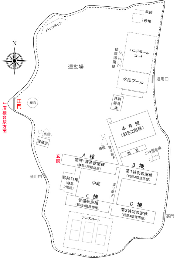 途中のランダバウト(ロータリー)を越えて更にまっすぐ進み、唐櫃小学校の裏門を過ぎたところで左に曲がると、「正門」が見えます。