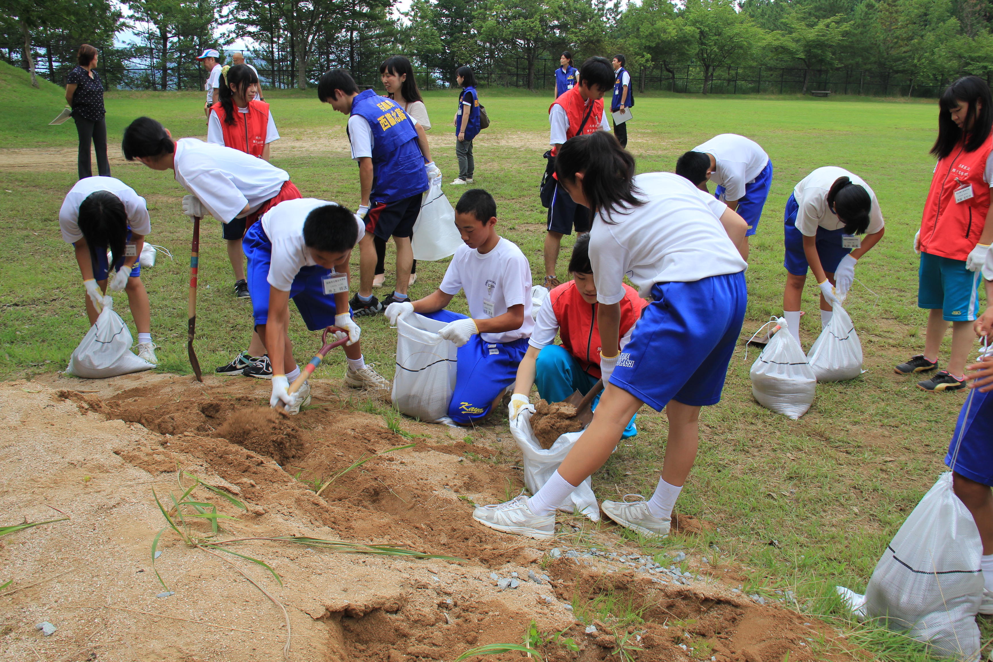 この合宿は「実践的安全教育(防災)総合支援事業」推進校である県立高校5校と姫路市立中学校2校が参加し、ボランティアや阪神淡路大震災等の講話、土嚢づくりや炊き出し等の体験活動、学校が避難所になった際に何をすべきかなどをテーマにワークショップを実施し、未知の災害が発生した際、臨機応変に対応できる力を養いました。