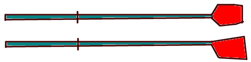 | オールだよ。 端っこの赤い部分がブレードって言って水をつかむ部分。 左の端っこが手で持つ部分。 公園ボートのよりもずっと長く、約3mもある。 最近は水を効率よくつかめるために下のような非対称のものが主流。 選手にあわせてテコ比なんかも微調整したりするぞ。 オールを取り付ける部分にもミリ単位の調整、 角度の微調整がかなりシビアになされてます。 |
