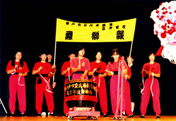 本校は神戸市鈴蘭台に位置し、自然に囲まれた緑豊かな環境にあります。龍獅團は、1987年に神戸の土地柄を生かした活動として取り組み、11年目を迎えました。神戸在住の華僑青年に直接ご指導頂き、道具はアジア圏からの輸入を独自で行う等、草の根的な国際交流を実践しています。今年は龍舞を修得し、更に活動を広げ内容の充実を図りました。この獅子舞や龍舞は、神戸市地域民俗無形文化財に指定された神戸南京町春節祭で舞われるもので、本校も出演しています。