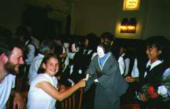 ハンガリーを代表する作曲家コダーイの誕生地であるせいか、音楽・芸術に対する意識が非常に高く、大人はもちろん、小学生ぐらいの子が、身を乗り出して見ていました。人形の解説を真剣に聞き、実際に体験しようとする人が多く、公演後の交歓では、たくさんの交流の場がもてました。カーテンコールにこたえて、人形も観客と握手し、舞台の余韻の中で交歓が続きました。
