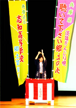淡路島の南部に位置する志知高校は、今年で創立24年目の学校です。郷土芸能部は、淡路人形浄瑠璃から派生した「浄瑠璃くずし」と言われる淡路だんじり唄を継承して10年目を迎えました。今年のビッグニュースは、長年の夢であった京都府舞鶴市を訪れ、演目の「岸壁の母」を声高らかに歌ったことです。今年も、戦争の悲惨さを胸に刻み、部員がこころをひとつにして「母と子の太い絆」を独特の節回しで歌い上げます。心を打つ場面がありましたら拍手をお願いします。