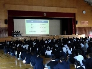 1学期中間考査が終了した5月24日(火)の2限に、生徒総会および生徒役員選挙立ち会い演説会が、1・2年生は体育館、3年生はリモートによりHR教室で行われました。