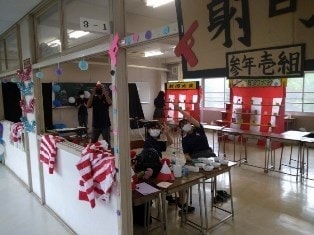 今回の文化祭のテーマは「協心戮力~今だけの青春を~」です。心と力を合わせ互いに協力して物事に取り組むという意味です。1年生は、色つきのセロハンを用いてステンドグラスを作製し、体育館入り口に飾りました。ステンドグラスが日の光を和らげ、鮮やかで優しい空間を創り出していました。2年生は、2学期に予定されている修学旅行の行き先である沖縄に因んだ貼り絵を作製し、体育館の壁を飾りました。とても大きな作品で迫力がありました。「夏至南風」とは、沖縄の梅雨明けを知らせる風のことで、コロナ禍が早く明けるようにとの願いがこめられました。3年生は、各教室で模擬店を出店しました。ゲームや手作り体験など、各クラスで工夫を凝らした楽しい企画ばかりで、大勢の生徒たちで賑わいました。