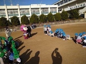 授業を選択している生徒たちは、準備から当日の進行までを担当し、園児たちのお世話をしました。本校のマスコットキャラクター「めいぽん」も登場し、凧あげ大会を盛り上げました。
