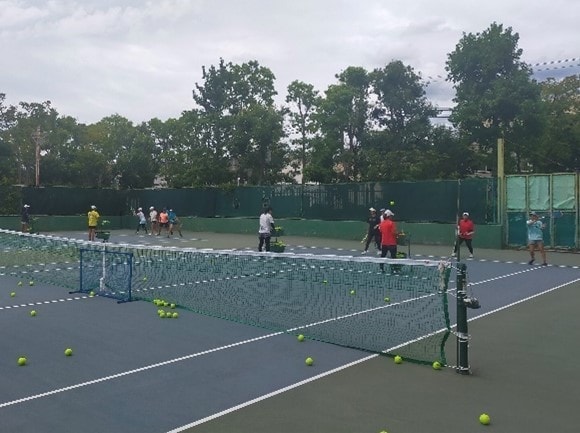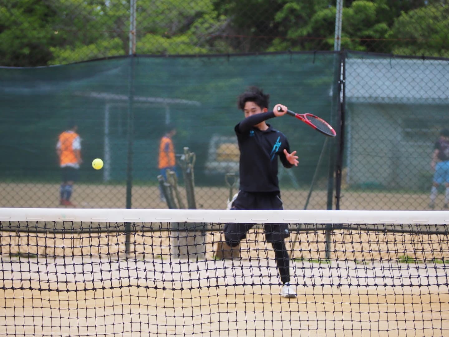 通常は、テニスコートでの基礎練習から試合形式まで行い、雨天時にもネット打ちやフットワークを中心にトレーニングを行っています。