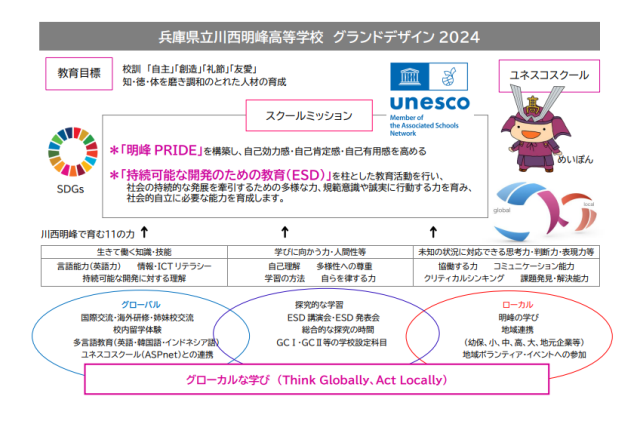 - 自国文化を理解し、ふるさとを愛する心を持つとともに、グローバルな(地球規模の)視点を持って持続可能な未来を切り拓く意欲を持つ人物。